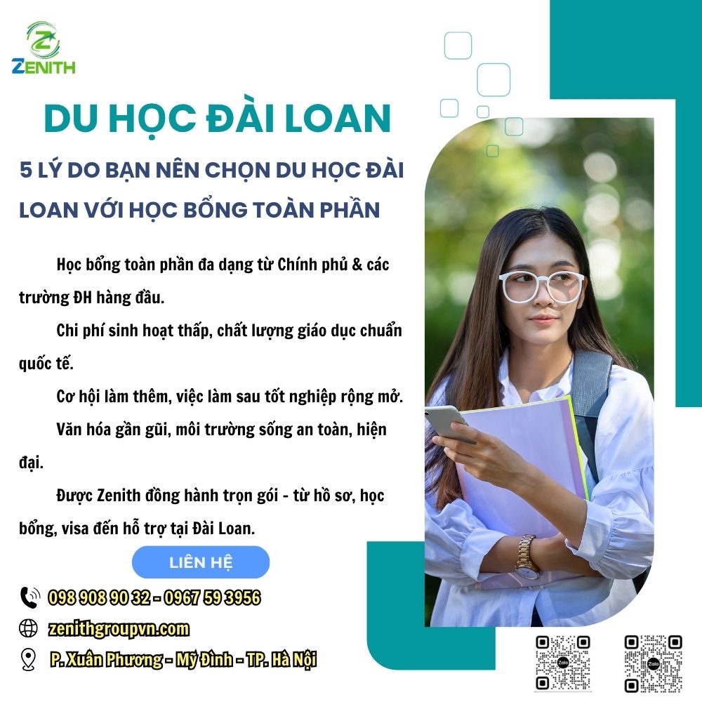👉 Liên hệ ngay với Công ty Cổ phần Hợp tác Quốc tế Zenith để được tư vấn chi tiết và chuẩn bị hồ sơ du học Đài Loan ngay hôm nay!
