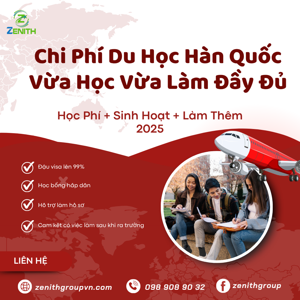 👉 Để giảm gánh nặng chi phí du học Hàn Quốc vừa học vừa làm, bạn có thể xin học bổng giảm 30–100% từ các trường đại học. Công ty du học Zenith thường xuyên hỗ trợ học sinh đạt học bổng đầu vào nhờ hồ sơ chuẩn và thư giới thiệu mạnh.