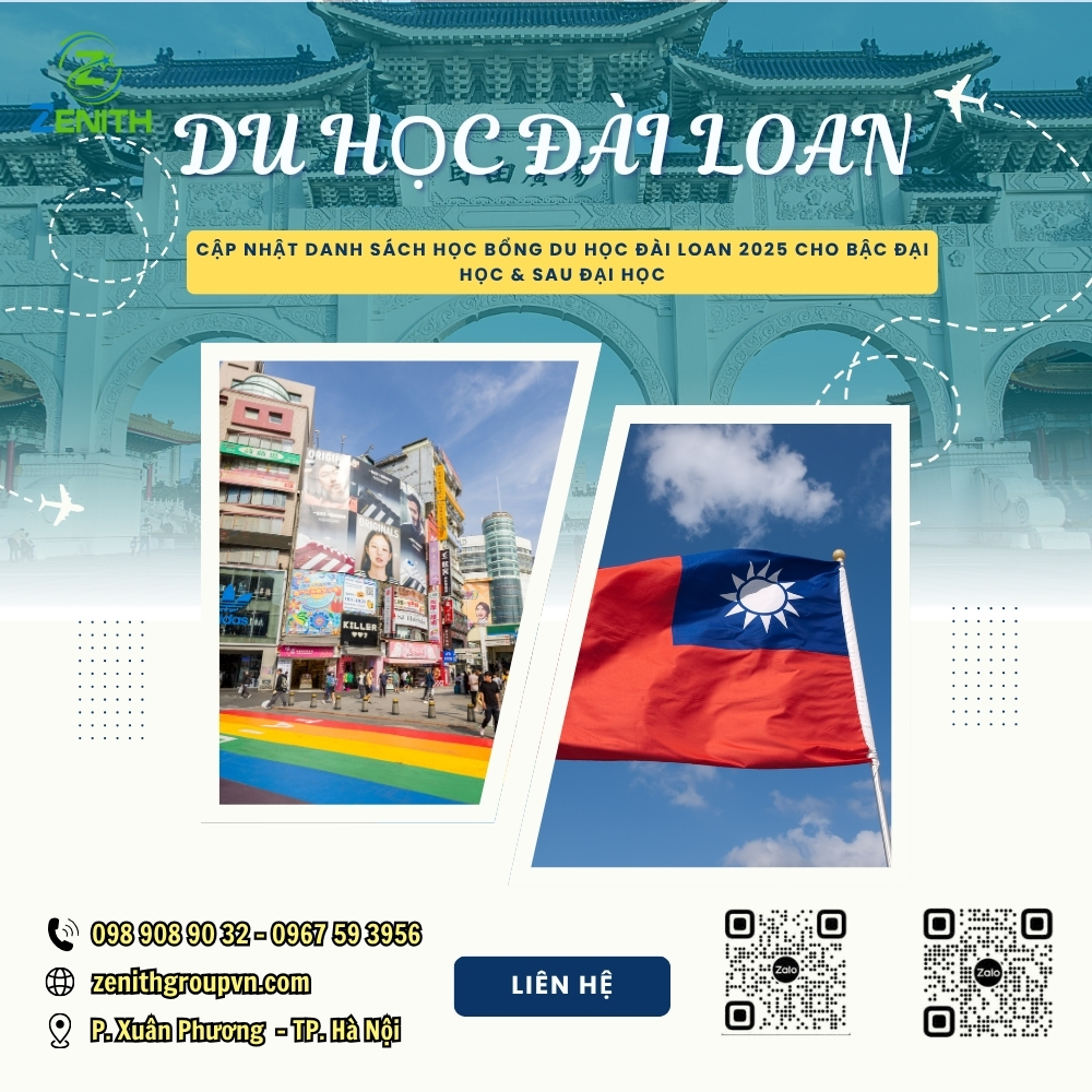Công ty Zenith – đơn vị đồng hành uy tín trong lĩnh vực tư vấn du học châu Á, hiện đang hỗ trợ hồ sơ học bổng du học Đài Loan miễn phí cho học sinh, sinh viên Việt Nam năm 2025.
