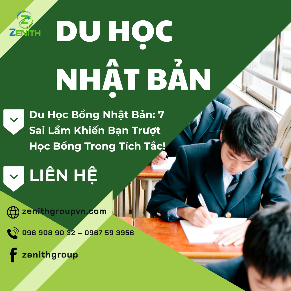 Bạn đang lên kế hoạch du học bổng Nhật Bản nhưng loay hoay không biết bắt đầu từ đâu? Rất nhiều ứng viên tài năng đã bỏ lỡ cơ hội vì chỉ mắc “những lỗi nhỏ” mà không để ý. Trong bài viết này, Zenith – công ty hỗ trợ chuyên sâu – sẽ phân tích 7 sai lầm cơ bản khiến bạn trượt du học bổng Nhật Bản và cách khắc phục từng lỗi. Bài viết dài ~6000 từ, tối ưu SEO với du học bổng Nhật Bản xuất hiện đầy đủ sẽ cung cấp bạn checklist rõ ràng để ứng tuyển thành công du học bổng Nhật Bản.
