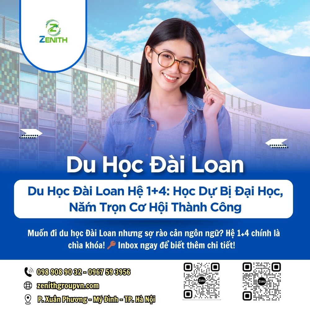 Du học Đài Loan hệ 1+4 (hệ dự bị đại học) đang trở thành xu hướng mới cho học sinh Việt Nam. Khám phá lợi ích, chi phí, điều kiện và cơ hội với sự hỗ trợ từ công ty Zenith.