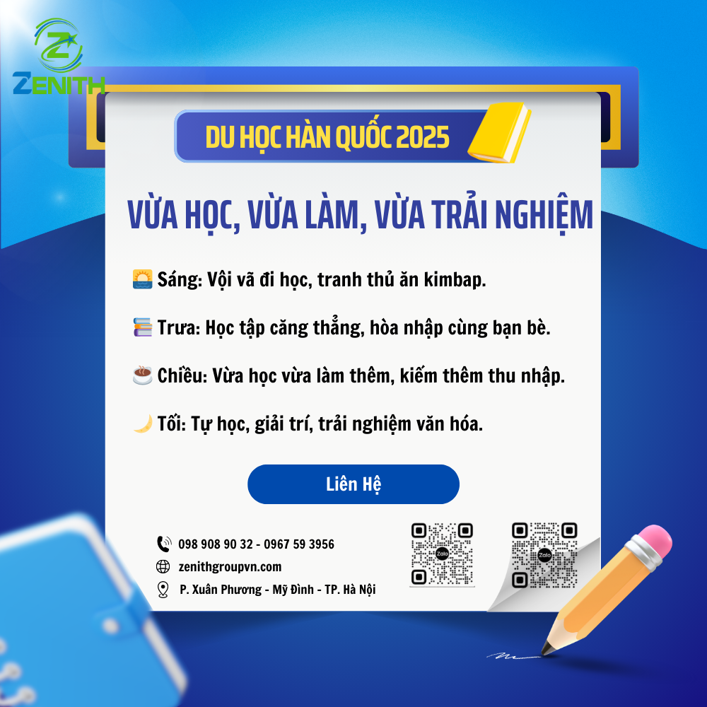 Một ngày của Du học sinh Hàn Quốc là sự kết hợp giữa học tập, làm thêm và trải nghiệm văn hóa. Dù nhiều khó khăn, nhưng đây cũng là hành trình quý giá, giúp các bạn trưởng thành vượt bậc. Với sự đồng hành của công ty hỗ trợ du học Zenith, các bạn sẽ có sự chuẩn bị kỹ lưỡng, từ tài chính, học tập đến định hướng nghề nghiệp. Nếu bạn đang ấp ủ giấc mơ du học Hàn Quốc, hãy để Zenith là người bạn đồng hành tin cậy.